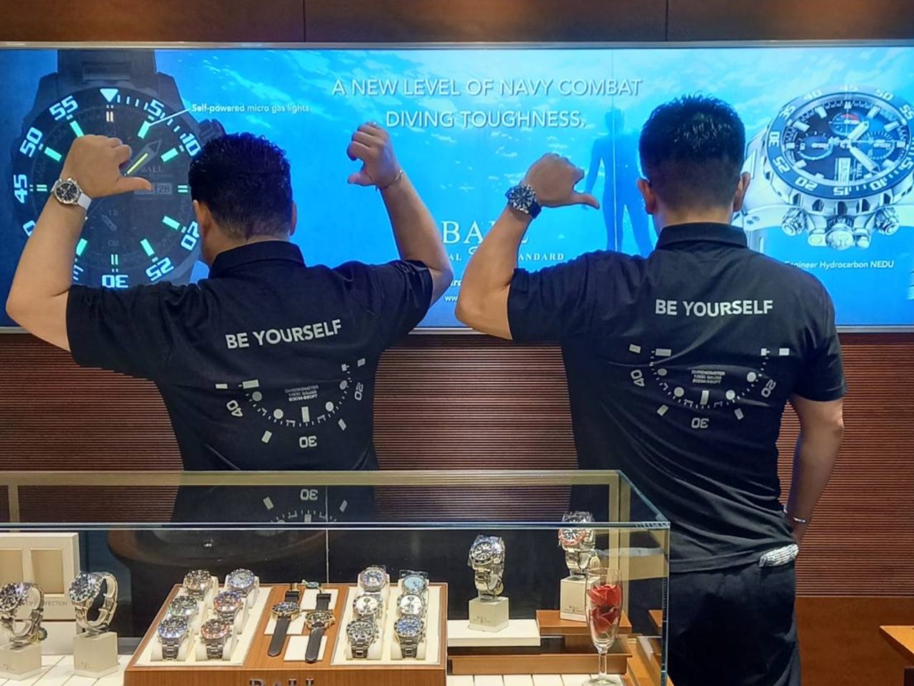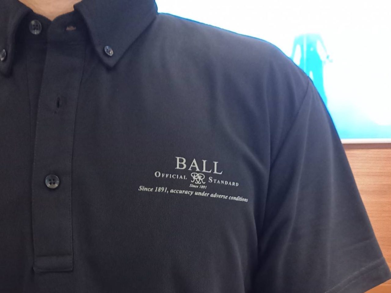 ユニフォームのベースはブラックのシンプルなポロシャツ。左胸にはさりげなく光るBALL Watchのロゴが入っていて、上品かつ存在感があります。