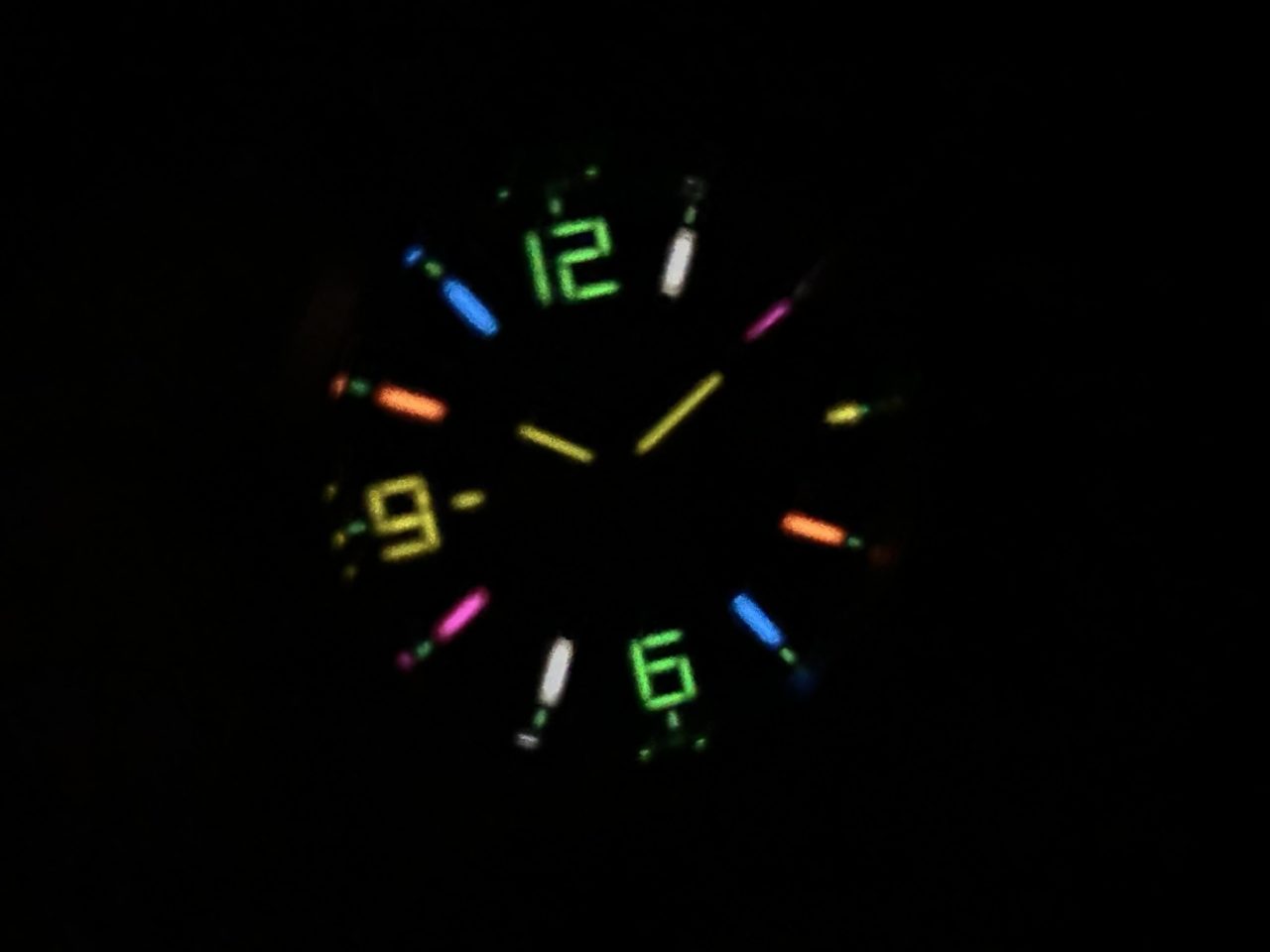 文字盤のインデックスは6色にカラフルに光る仕様で、光の角度で変化するレインボーカラーは見ているだけでワクワクします。針と文字盤には28個の自発光マイクロ・ガスライトを搭載しており、暗い場所でも視認性は抜群です。