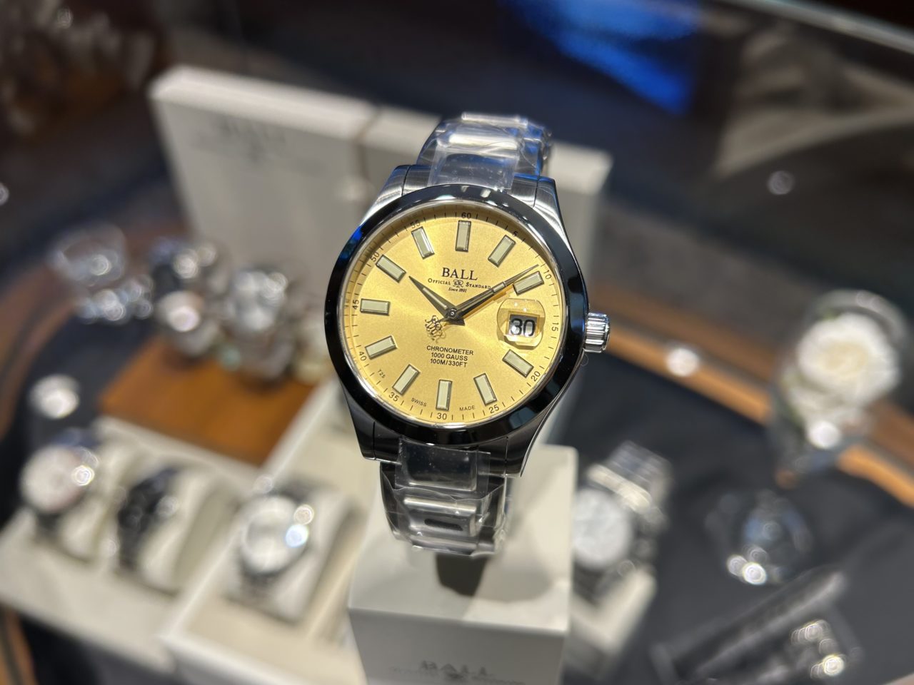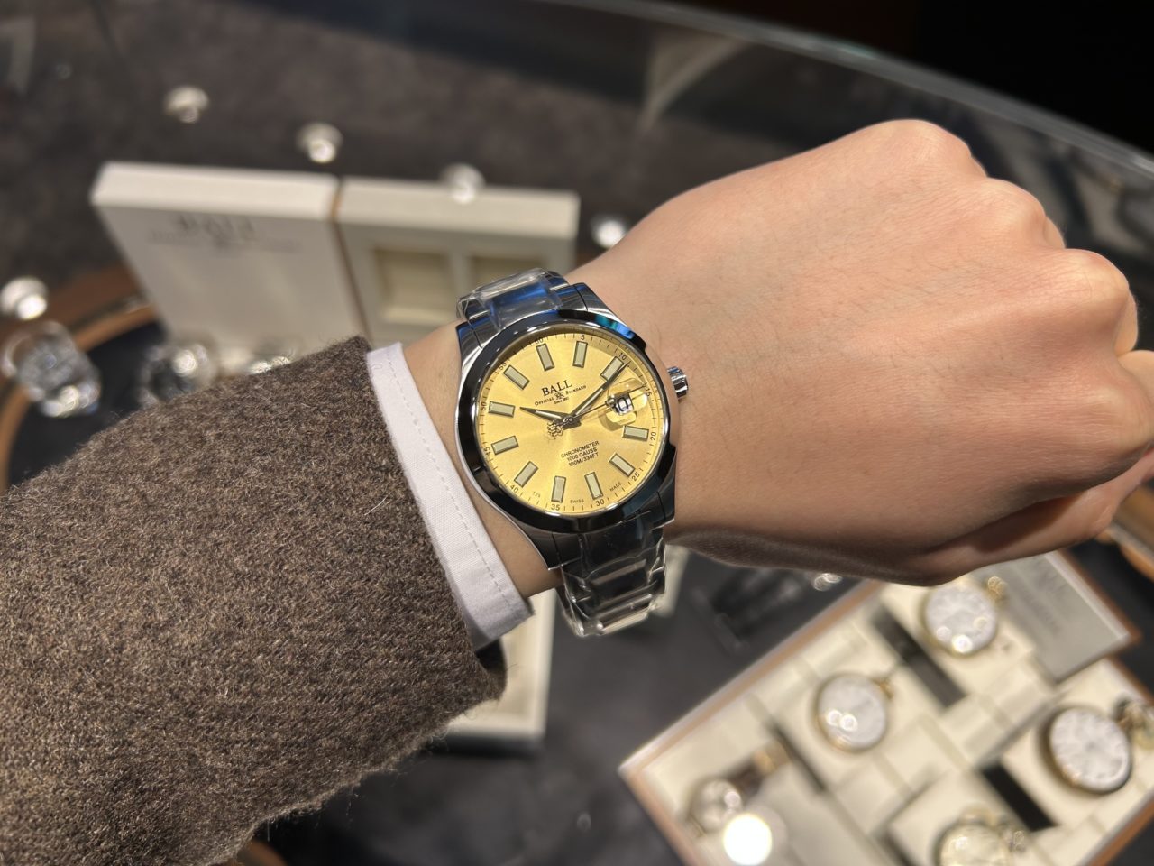 新採用のゴールドカラー文字盤には、繊細なサンレイ仕上げが施されており、光の当たり方によって表情が変化します。派手さを強調する色味ではなく、スーツスタイルなどのビジネスシーンにも自然に馴染む絶妙なトーンです。インデックスや針とのコントラストも良好で、視認性をしっかり確保している点は、実用時計を追求してきたボール ウォッチらしいポイントだと感じます。