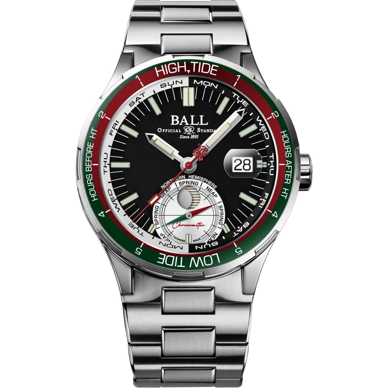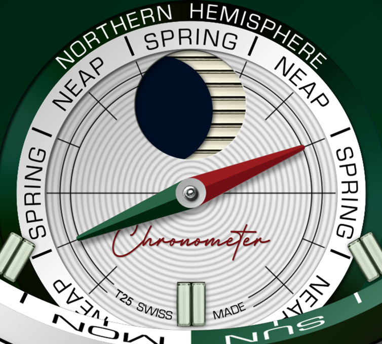 さらに6時位置のサブダイアルでは、「Spring(大潮)」「Neap(小潮)」を指す針で潮の周期を確認できます。