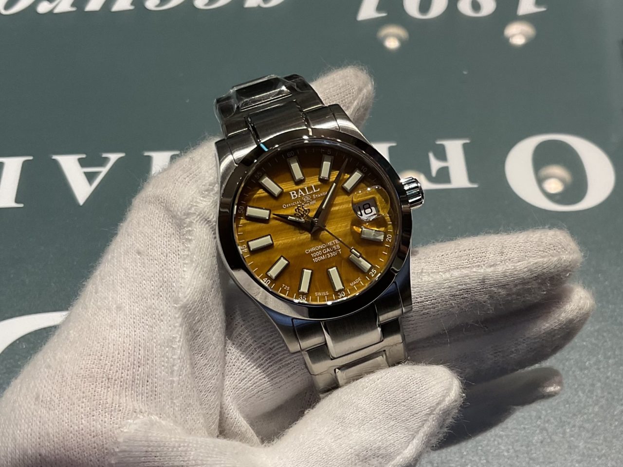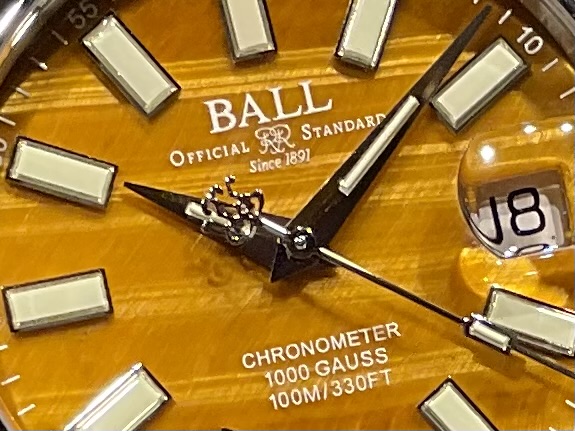 最大の魅力は、なんといってもタイガーズアイ文字盤。天然石ならではの模様と、光の角度によって表情を変える独特の輝きは、同じものが二つと存在しない唯一無二の存在です。腕を動かすたびに陰影が変化し、思わず見入ってしまう美しさがあります。