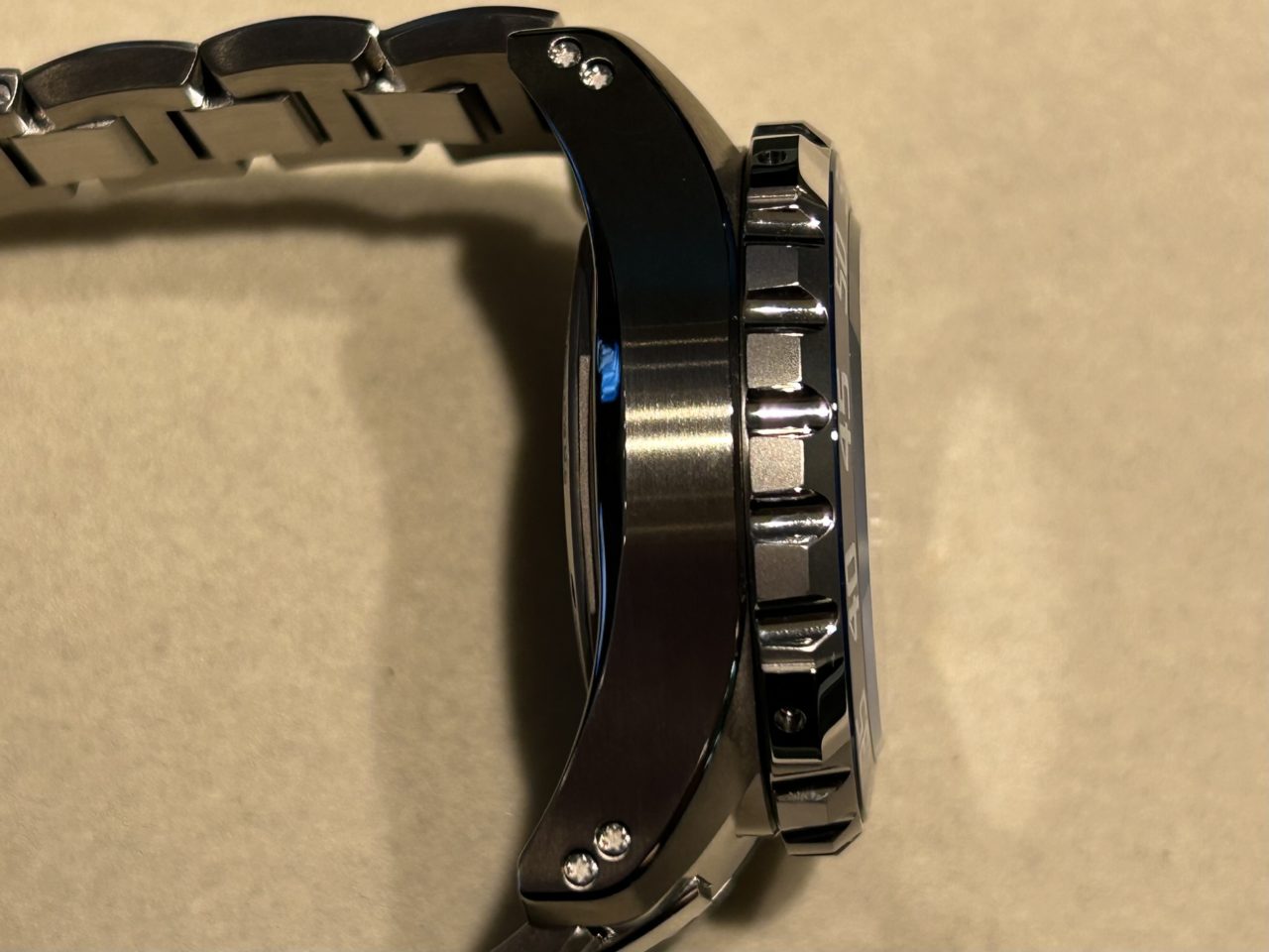 視認性も抜群です。文字盤、針、プッシュボタンには 自発光マイクロ・ガスライト を装備。深海や暗所でも光を必要とせずに時間を判読できるのは、実際に手に取ってみるとかなり便利です。さらにベゼルトップは高硬度セラミック製で、5層構造のスーパールミノバ塗布により耐傷性と視認性を両立しています。
