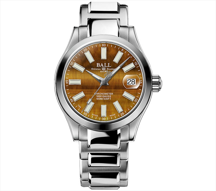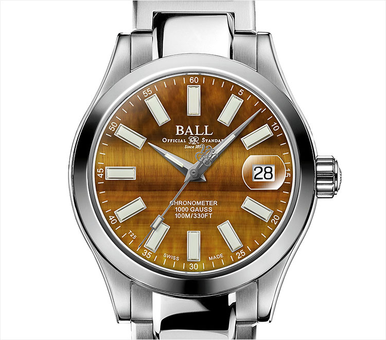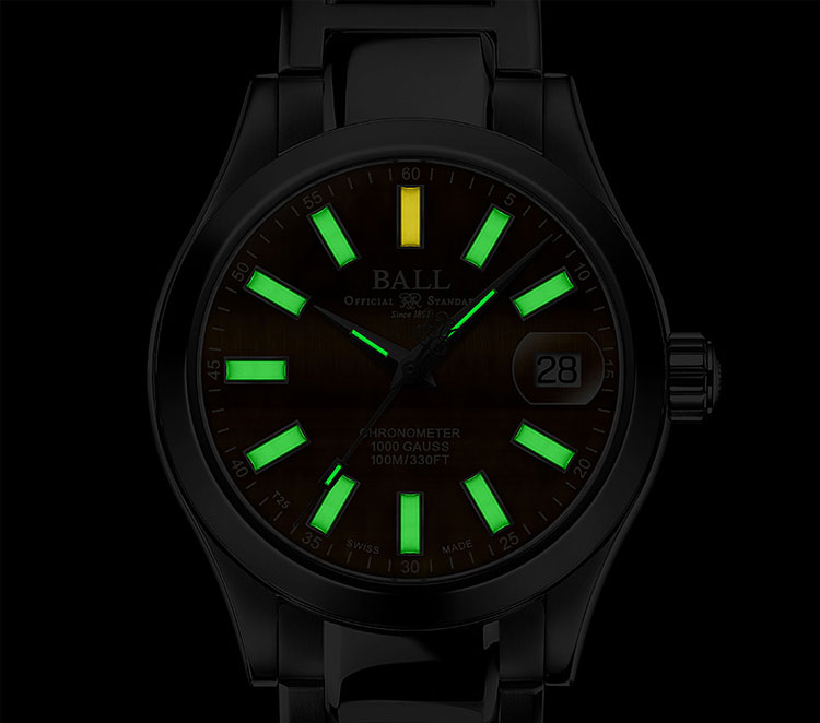 正確な時刻表示の追求は、ボール ウォッチが鉄道時計の製造をスタートした19世紀初頭から続く伝統です。文字盤下部にある「CHRONOMETER」の表記は、高精度の権威であるC.O.S.C.(スイス公式クロノメーター検定機関)による15日間の厳格な精度テストをパスした証しです。
