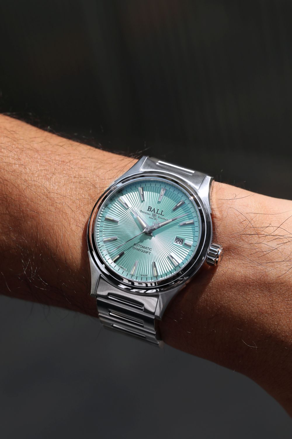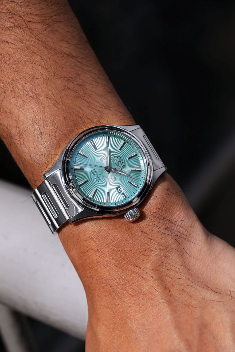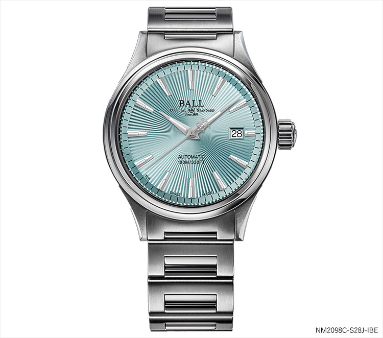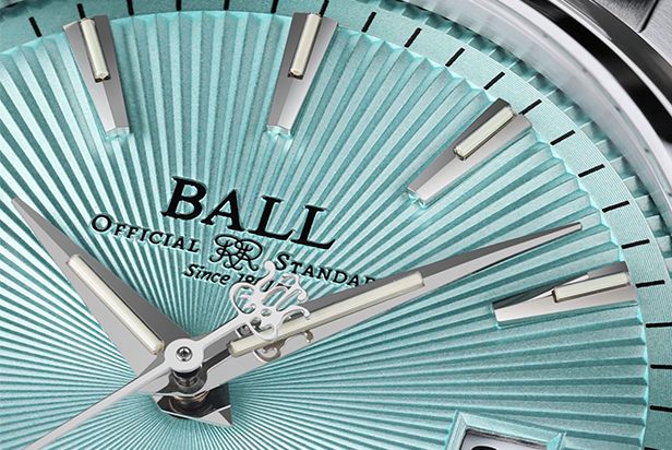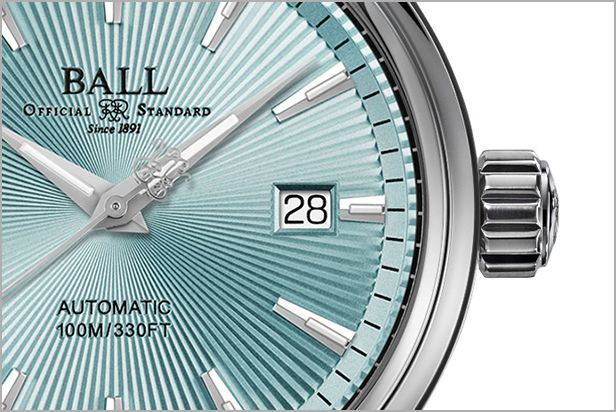 そして今年、新たにアイスブルーカラーのサンレイ文字盤が加わることで、コレクションの幅がさらに広がります。サンレイ文字盤とは放射状の彫り加工が施された装飾技法で、サンバースト仕上げとも呼ばれ、太陽光線(Sunray)に由来し、光の当たり具合によって色味や質感が変化するのが特徴です。文字盤の中心軸(太陽)から外周(宇宙)へと光が広がるような放射状の模様が形成され、その角度によって変化する色のニュアンスが美しく、今回のアイスブルーカラーによって、さらに洗練された印象を演出します。